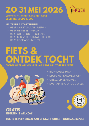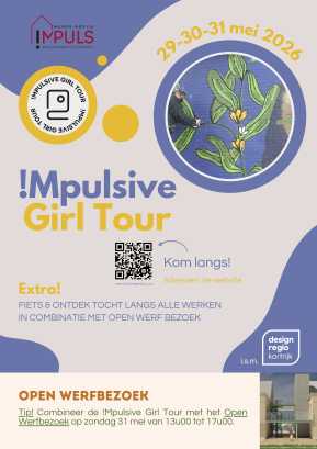 Op 29,30 en 31 mei vindt de laatste editie van de !Mpulsive Girl Tour plaats met als thema 'samen'. Via onderstaande kaart kan je de werken ontdekken. Probeer zeker ook eens onze fiets & ontdek tocht. Deze kan je combineren met het open werfbezoek op 31 mei.
